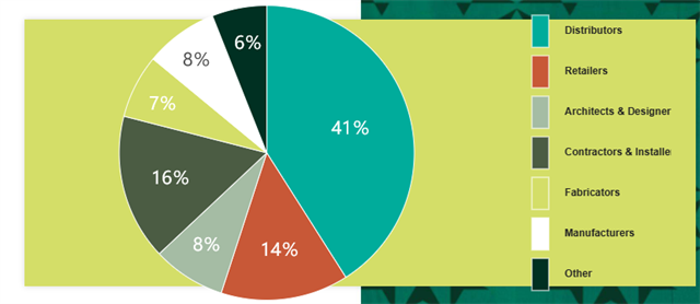 Coverings每年都吸引了大量來自全球各地的專業觀眾,他們主要是石材、瓷磚和馬賽克材料行業的專業人士,其中分銷商占總數的41%,零售商占14%,建筑師與設計師占8%,承包商與安裝商占16%,工具、機械制造商占15%,其他行業的觀展人員占6%。這說明Coverings的觀眾構成具有廣泛性和多樣性,這為參展商提供了與全球行業精英交流、合作和拓展業務的寶貴機會。