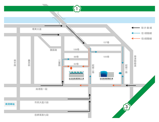 展館名稱:南港展覽館1、2館 (臺北市南港區經貿二路1號及2號)
